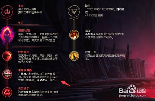 第三栏选择贪欲猎手,参与击杀可以使技能造成的伤害提供治疗效果,增加了生存能力。