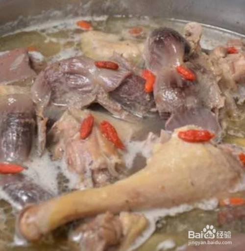 鸭肉出油后加入适量的热水,枸杞,红枣。大火烧开,倒入炖锅,中火煮1个小时。