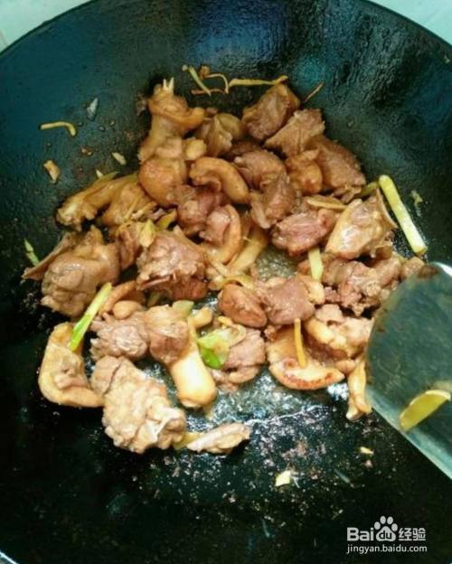 锅中加油,下入葱姜爆香,下入鸭肉煸炒出香味。