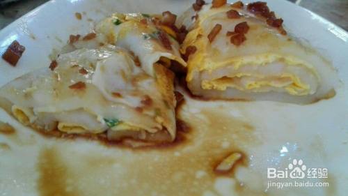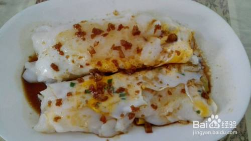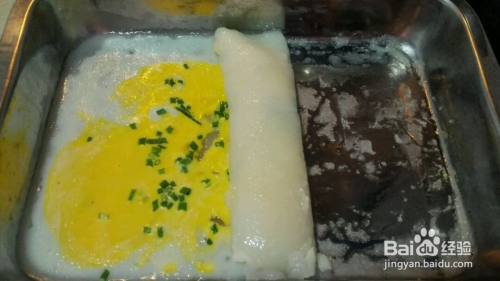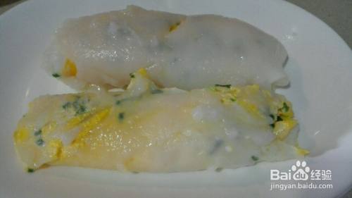 用铲子沿着边缘慢慢的把肠粉卷起来。