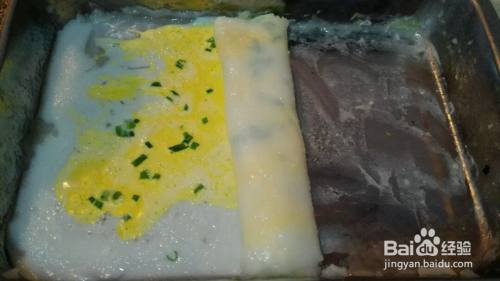 隔水放入盘,水开后在盘里刷入一层薄薄的油后倒入肠粉浆,第一次倒太多,蒸出来的肠粉太厚,总结经验后发现三小勺的量,刚刚好。