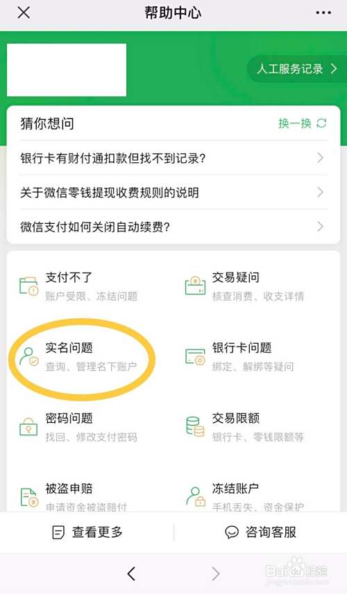 帮助中心界面点击“实名问题”