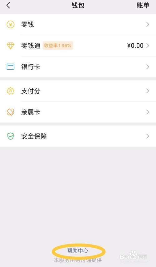 钱包界面点击下方的“帮助中心”