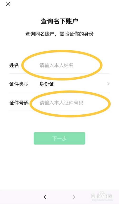 查询名下界面录入“姓名”和“证件号码”,点击”下一步“