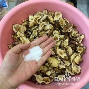洒适量的盐抓匀,放一点点点点点点盐就好,因为生抽和老抽里边都含盐,别放咸了《提前晾晒好的洋姜片》