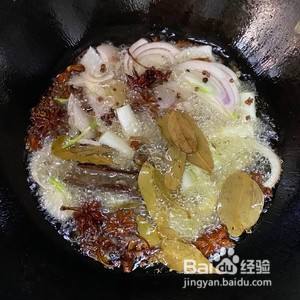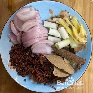 准备葱、姜、洋葱、花椒、八角、香叶、桂皮、