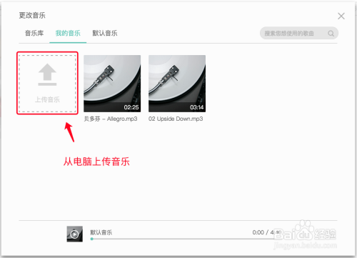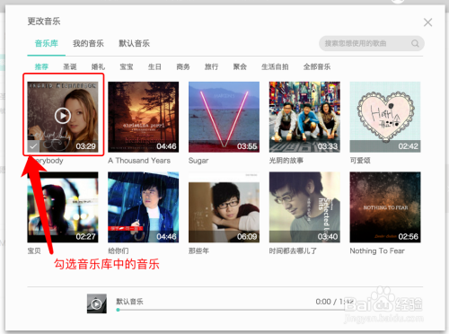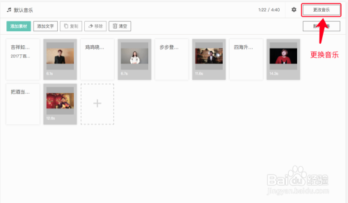 点击『更换音乐』按钮,可以在音乐库中选择合适的音乐,也可以上传自己喜欢的音乐,当视频时长大于音乐时长的时候,系统会自动循环背景音乐