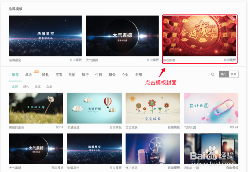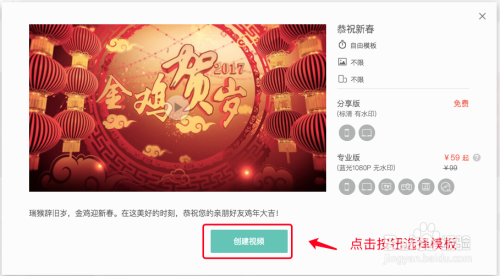 点击创建视频按钮后,会跳转都选择模板页面,选择『恭祝新春』模板,或者浏览其他主题模板,选择一款喜欢的。点击模板封面可以预览模板样片,点击『选择模板』即可进入编辑页面。