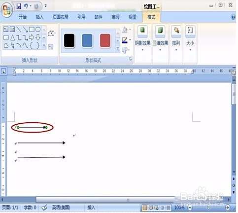 只要单击刚刚添加在文中的箭头,选中它之后会出现左右两个绿点,拖动其便能改变箭头的长短,向上或者向下拖动则是改变箭头的位置。