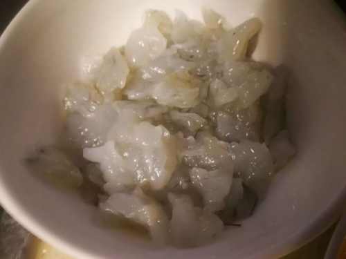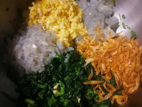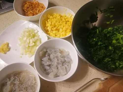 11葱姜切末,粉条煮熟切末,虾皮可以放锅中煸炒一下。