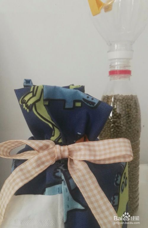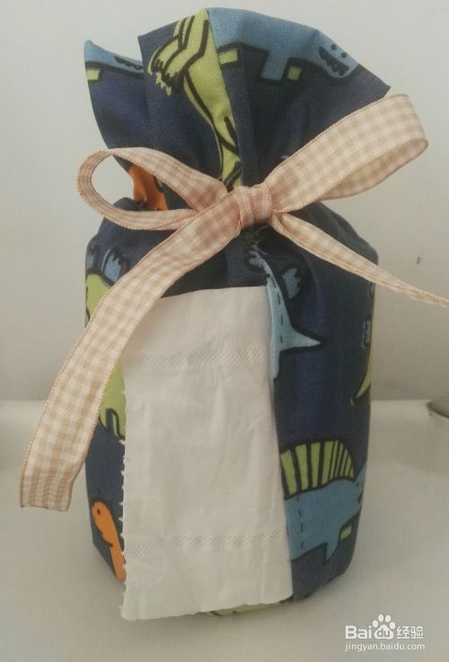 将油桶底和卷纸一同放入缝好的布袋中。油桶壁的开口处和布袋留的大口对齐,拽出卷纸头,把丝带抽紧系上就好了
