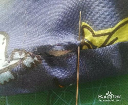 然后把布袋整个翻过来,翻到布的正面来,再在小口子上方齐平的地方也用线缝一圈