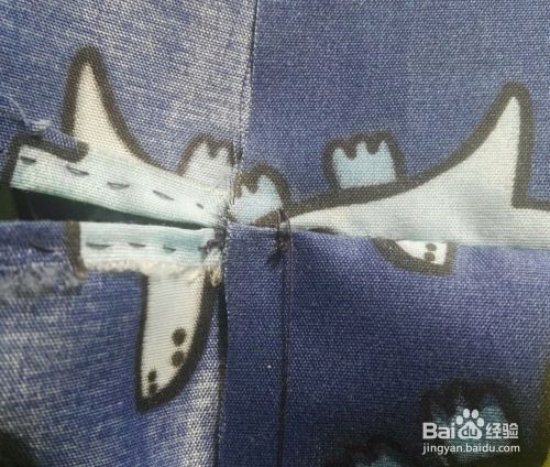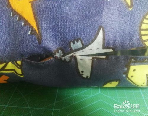 长方形布开口的处从高于卷纸高度的地方开始缝合,先缝上2厘米,留出1厘米左右的小口,接着剩下的全部缝合在一起。留口的地方把毛边折进去缝好,这样就缝成一个圆柱体布袋