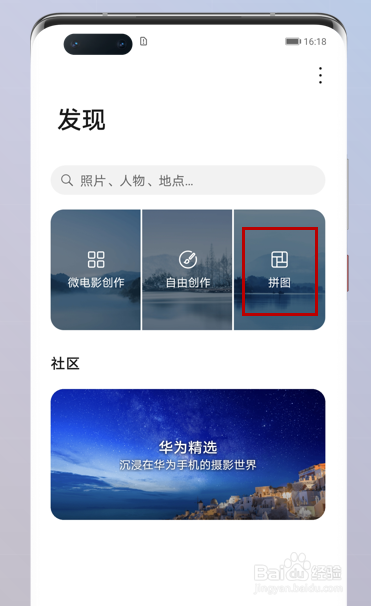 打开手机桌面上的图库,在“发现”页面点击【拼图】。