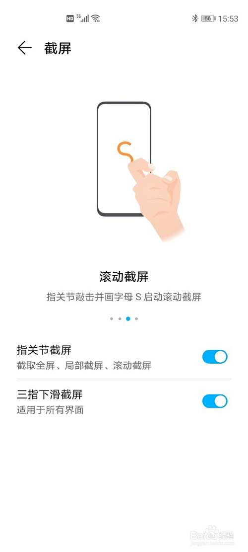 第四,滚动截屏,指关节敲击手机屏幕后画“S”型,此时屏幕滚动,轻触屏幕,截屏结束,如图示;