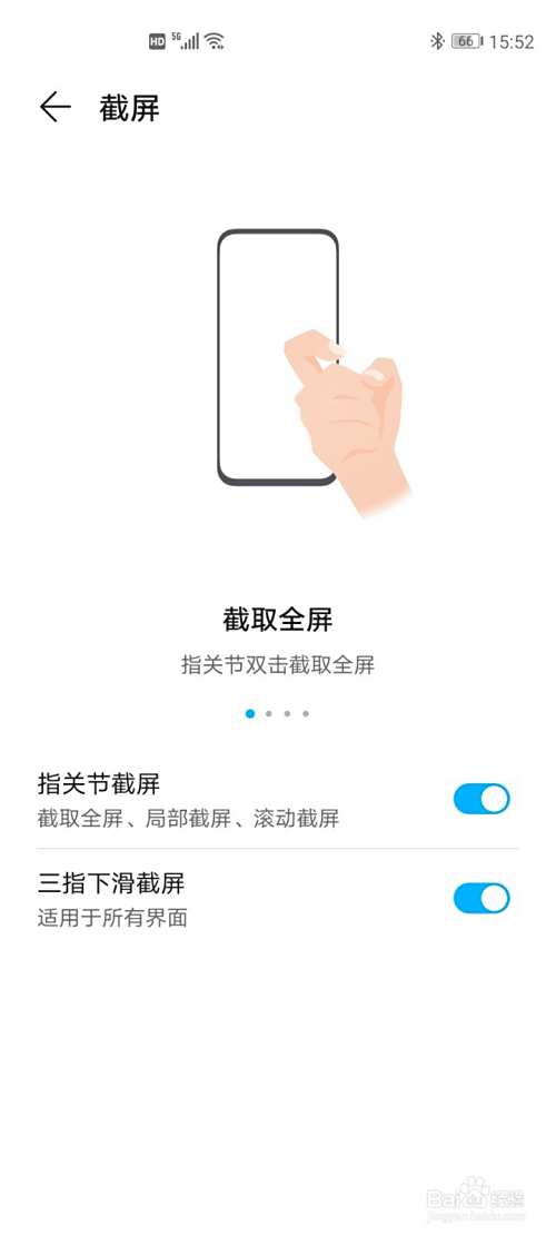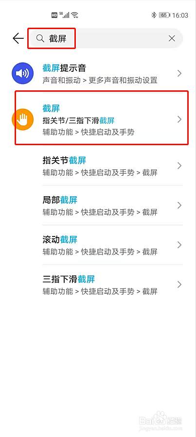 第一,打开手机设置,在搜索框时输入“截屏”,找到截屏设置开关,打开“指关节截屏”和“三指下滑截屏”,如图示;