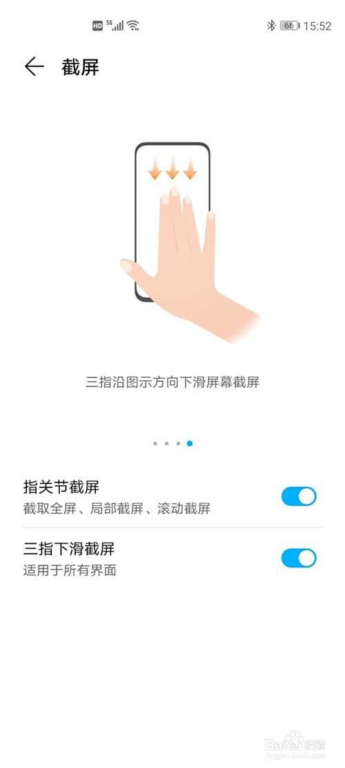 第五,三指下滑截屏,三指从手机屏幕上端触屏向下滑动,如图示。