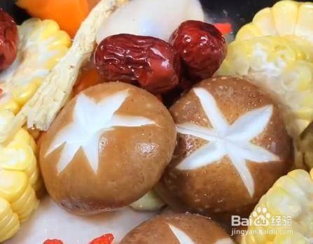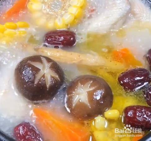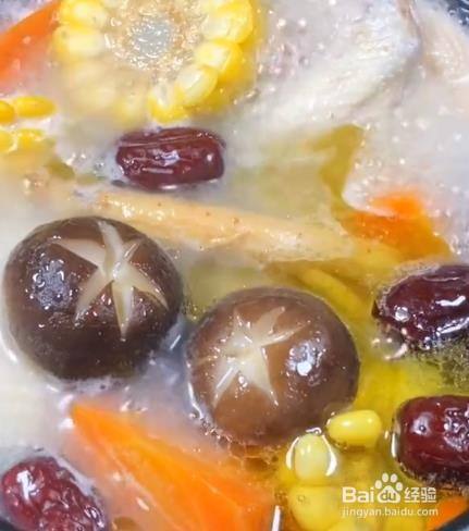 然后向锅中放入小鸡胡萝卜,玉米,香菇当参,红枣枸杞,加水没过食材,盖盖炖40分钟