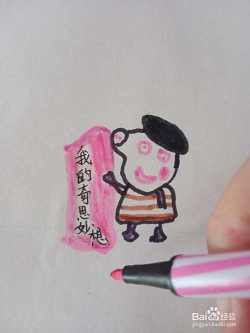 在小猪的左侧画一个长方形,涂粉红色,上面写上我的奇思妙想。
