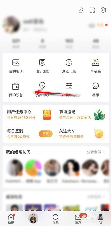 在微博我的界面点击进入我的钱包。