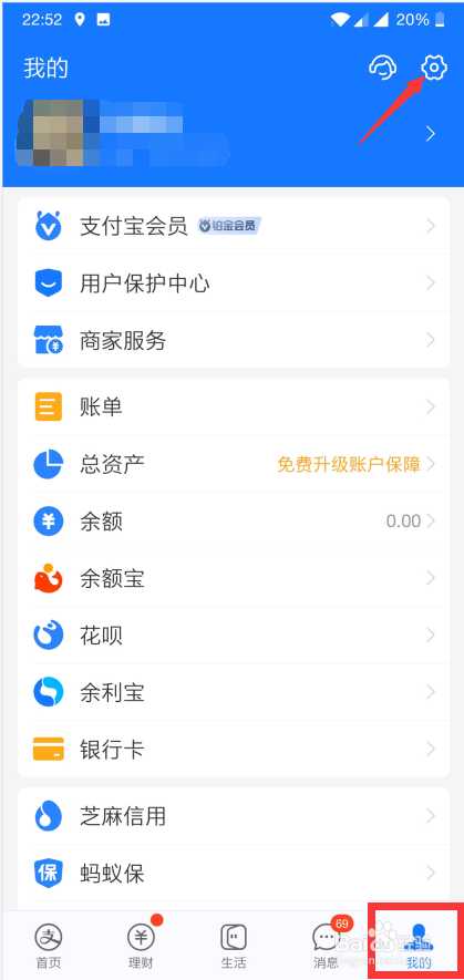步骤二,在“我的”设置页面,点击右上角“设置”齿轮图标,进入支付宝设置页面。