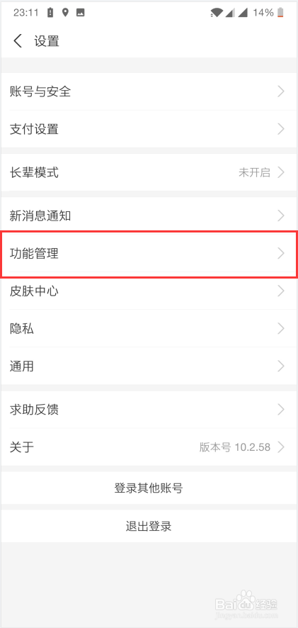 步骤三,进入支付宝设置页面中,选择“功能管理”选项,进入功能管理页面。
