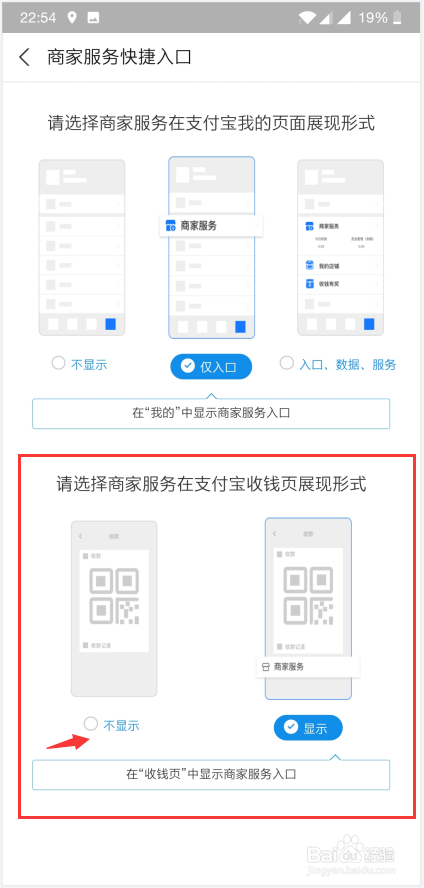 步骤五,进入商家服务快捷入口设置页面,在"收钱页"中显示商家服务入口中选择在“显示”就可以设置成功了。