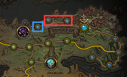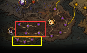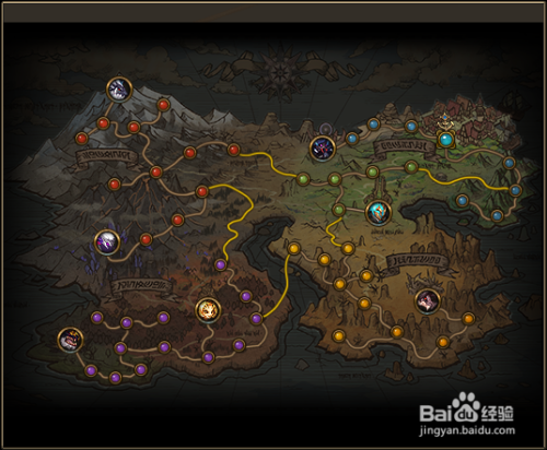 永恒大陆世界地图如下,分为五个区域。星光海岸(蓝点)/黄金平原(绿点)/迷失沙漠(黄点)/刀刃溪谷(红点)/黑风森林(紫点)。地图上每个圆点为一个房间,带有头像的点为领主所处位置。