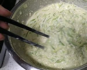西葫芦丝,葱碎,适量面粉,2个鸡蛋,放一起搅拌,如视频所示