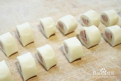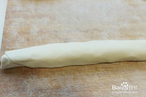 把面团擀成片状,长方形的面片,把这根香肠竖着切分成4条,依次首尾相接放在面片上。卷起来成为一个长条,尽量卷的紧一点,卷好之后揉搓一下,使长条粗细均匀一致。