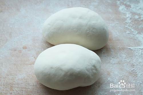 发酵好的面团移到面板上,撒干粉,开始用力的揉面吧。越揉越好吃,这个馒头好吃的关键呢。揉好之后分成平均2份。