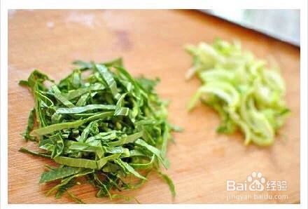 青菜洗净后切丝,梗和叶部分分开,蔬菜也可不放。