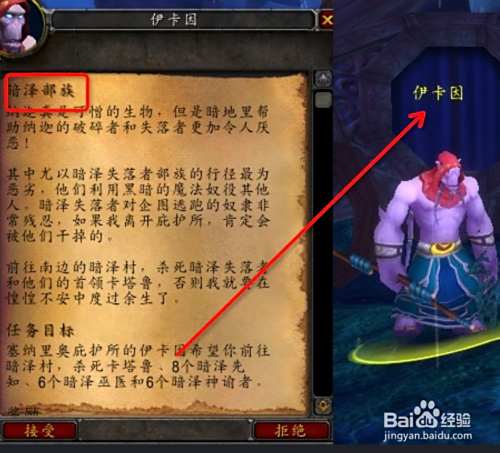 第一步:首先前往赞加沼泽找塞纳里奥庇护所的伊卡因对话接取暗泽部族任务。