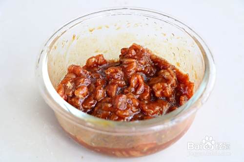 里脊肉切小块,放1勺生抽、2勺老抽、一点盐、2勺色拉油、1勺淀粉拌均匀,腌渍10分钟;