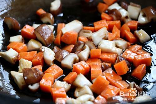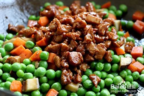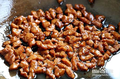 锅内放适量的色拉油,放入肉粒翻炒均匀盛出备用;