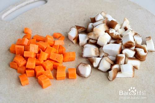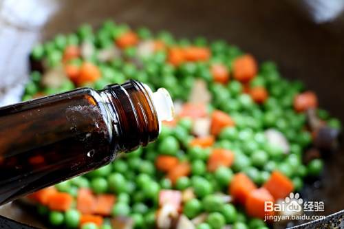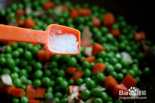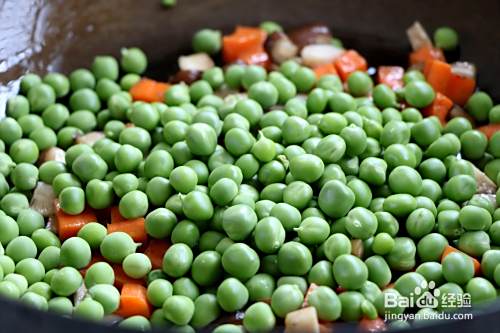 另起锅,加入色拉油,放入葫芦卜、香菇丁,翻炒1分钟左右,再加入豌豆,翻炒均匀;