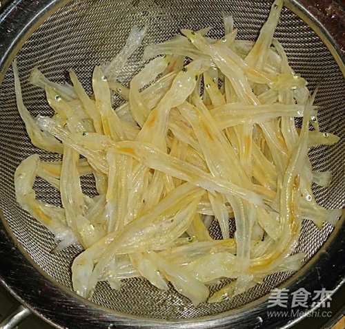 2银鱼干泡10-15分钟,捞起洗干净,沥水备用(银鱼干看着大小,自己掂量着泡的时间,反正要泡透,但又不能泡得太软了,吃起来的口感才会好)。