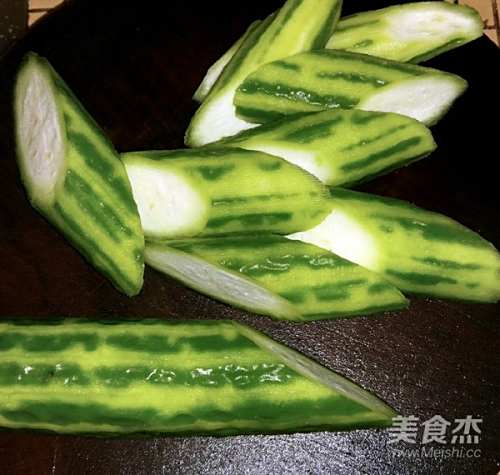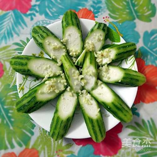 3蒜头切碎,一半撒丝瓜上面,水开蒸7分钟,时间到了开盖子,摊凉把多余水分倒去。