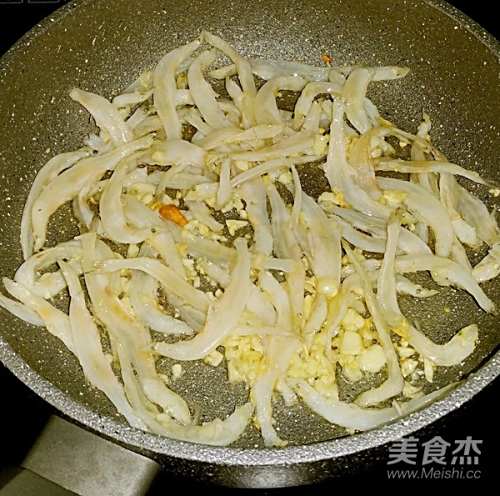4不粘锅热油,放蒜蓉翻两下再放银鱼干,一起慢火炸香。