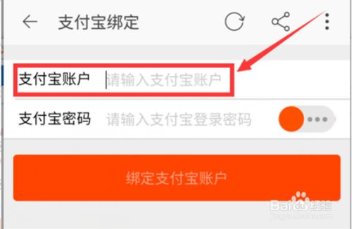 进入支付宝信息输入页面后,在“支付宝账户”处,输入新的支付宝账户的账户名,输入新的支付宝账户的账户名后,在“支付宝密码”处,输入对应的新的支付宝账户的登录密码。