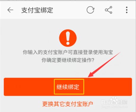 完成新的支付宝账户的账户名和密码输入之后,点击“绑定支付宝账户”按钮,进入绑定确认页面之后,点击“继续绑定”。