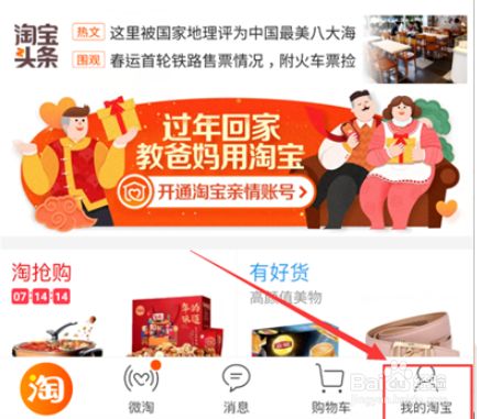 首先打开“手机淘宝”,进入手机淘宝主页面,进入手机淘宝主页面后,在主页面下方找到“我的淘宝”,点击“我的淘宝”,进入账户页面。