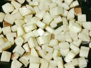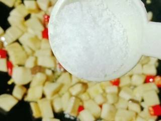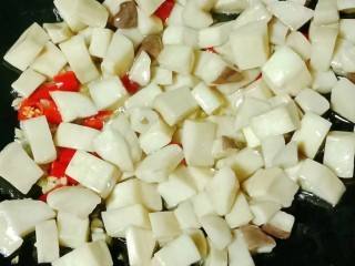 8刚下锅时杏鲍菇会出水,炒至水干变软后装盘待用。