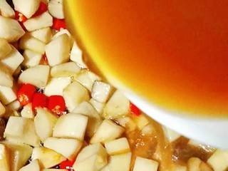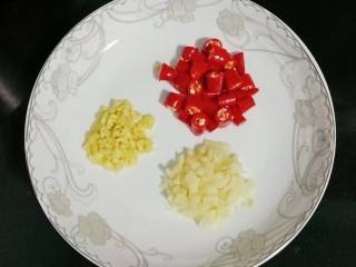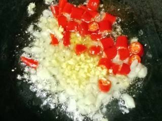 9另热锅下油,倒入姜蒜沫和小米椒爆香。