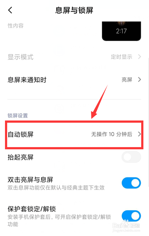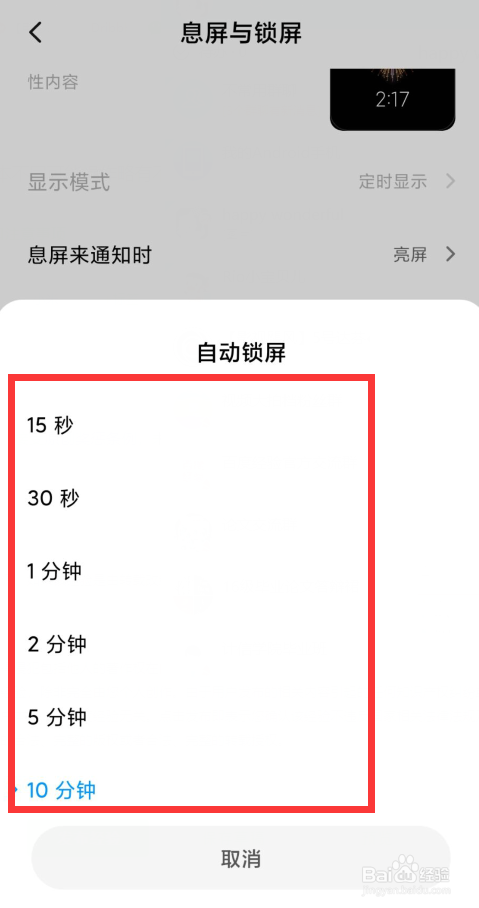 4、在这可以设置自动锁屏时间,选择需要的时间即可