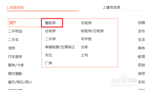 点击后,在发布信息分类中,选择房产的分类,然后选择整租房。