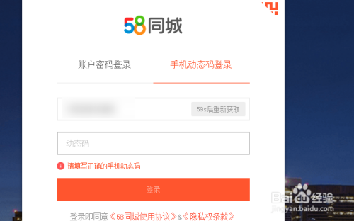 打开58同城进入后,点击登录的选项,在登录界面输入账号信息进行登录。