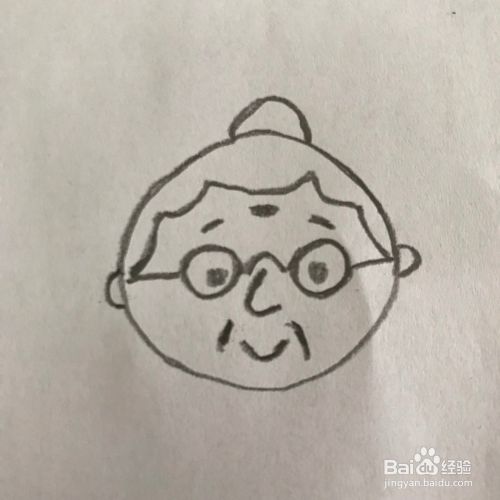 在干净的白纸上画上奶奶圆圆的脸庞、鼻子上的眼镜,见下图