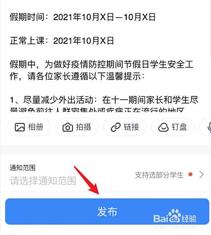 幼儿园国庆放假通知,可以在钉钉的家校通知内进行发布。以下为详细步骤说明: