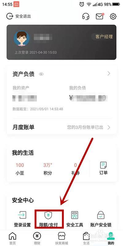 进入【个人中心】页面,找到【安全中心】选项组下的【限额/支付】选项点击。